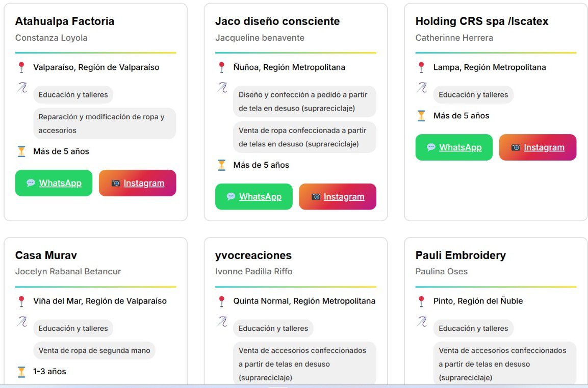 Directorio Textil Circular se llama la iniciativa digital creada por la fundación del mismo nombre, que busca hacer conversar a las cientas de emprendedoras que trabajan a escala humana en este rubro. La Fundación Textil Circular pretende, a través de este catastro, que dichos emprendimientos puedan incidir en la redacción del próximo decreto de metas del producto prioritario textiles de la Ley REP. Hasta ahora, cuentan con iniciativas de Arica a Punta Arenas, incluida Rapa Nui, donde han podido detectar cuáles son las áreas de la economía circular donde hay más avances y más brechas según los territorios.