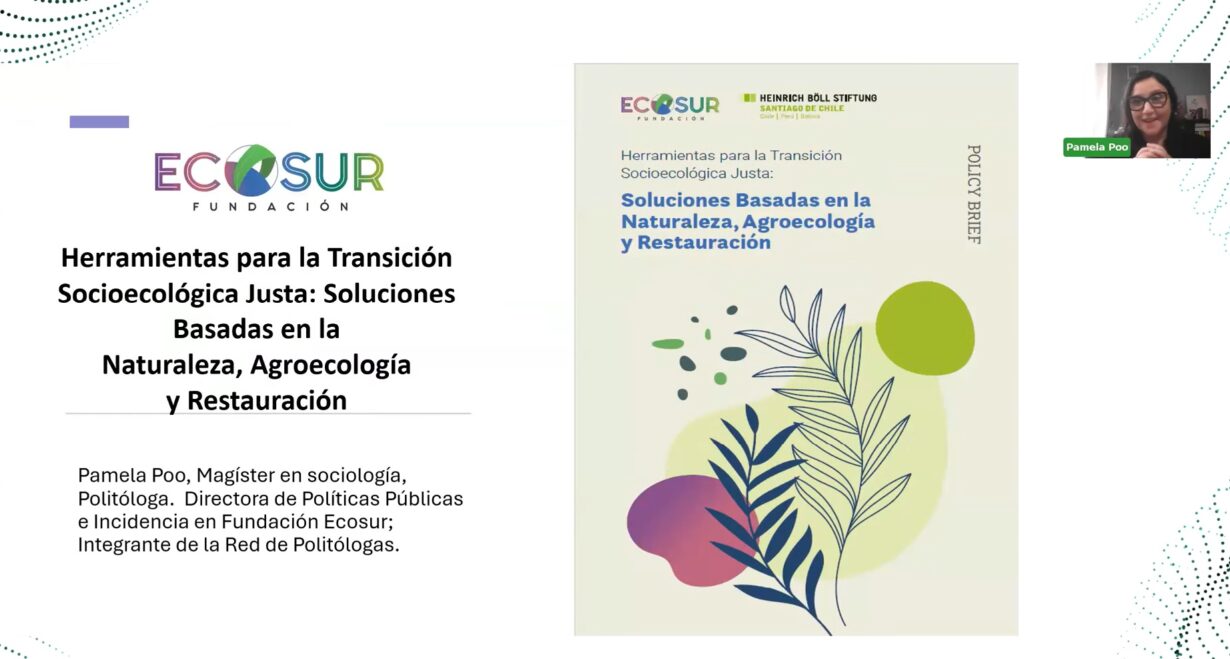 Posteriormente, la directora de Incidencia Política de Fundación Ecosur, Pamela Poo Cifuentes, fue la encargada de presentar los aspectos más relevantes contenidos en el policy brief, del cual es autora junto a Diego Astudillo Rivera y Joaquín Ortiz Court. El documento, según señala en su introducción, tiene el propósito de “influir en los tomadores de decisión, y actores que planifican y ejecutan inversiones públicas, con el fin de que impulsen medidas que apoyen la mejora y agilización de la implementación de Soluciones basadas en la Naturaleza, agroecología y restauración. Tendiendo a que se involucren, y cumplan un rol y trabajo mancomunado, para generar resiliencia y preparación ante los escenarios adversos que ya están aquí”.