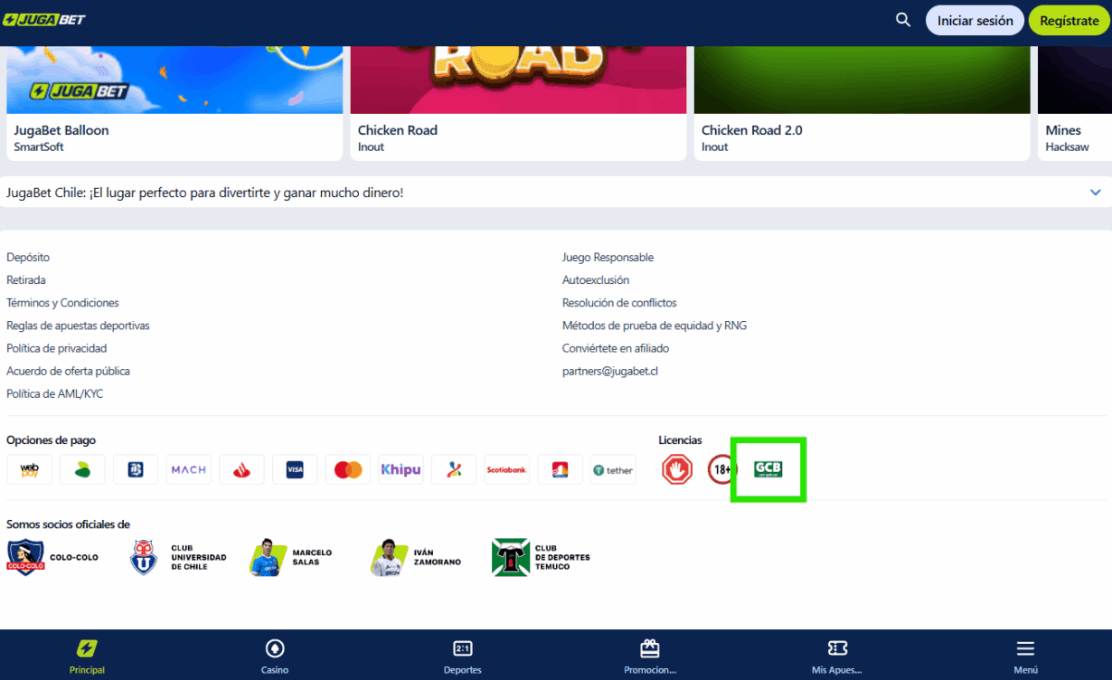 - Atención al cliente: chat en vivo 24/7 en español y correo electrónico (support@jugabel.cl).