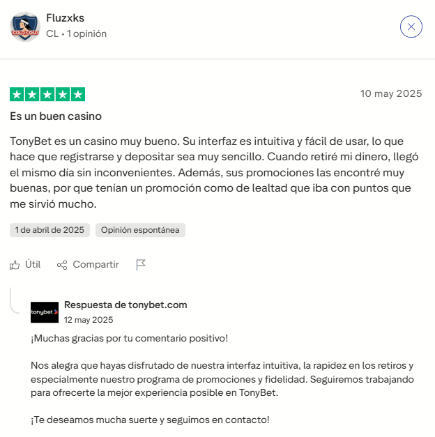 - Atención al cliente: chat en vivo 24/7 en español y correo electrónico (info@tonybet.com).